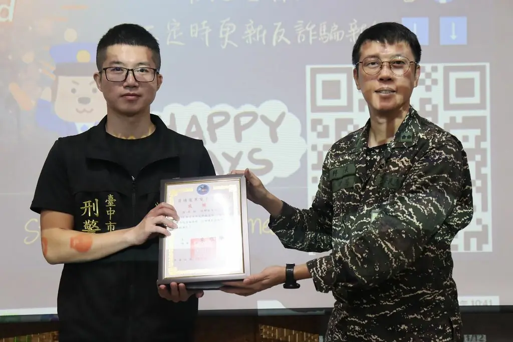 為提升青年族群及國軍官兵的反詐意識,臺中市警察局第五分局偵查隊隊長謝志遠、巡官許驛豪近日分別前往替代役與軍中場域,透過生活化、幽默互動的方式,拆解常見詐騙手法,強化官兵與役男的識詐能力。