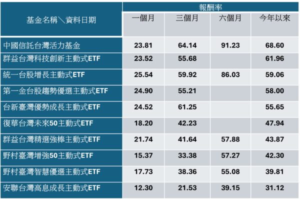 值得留意的是,台股中小型共同基金:中國信託台灣活力基金今年以來績效更是達68.6%,更勝過市場熱門的主動式ETF 00992A、00981A等標的。同時,在最近三個月、六個月表現也極為出色。