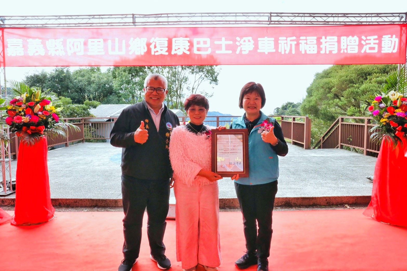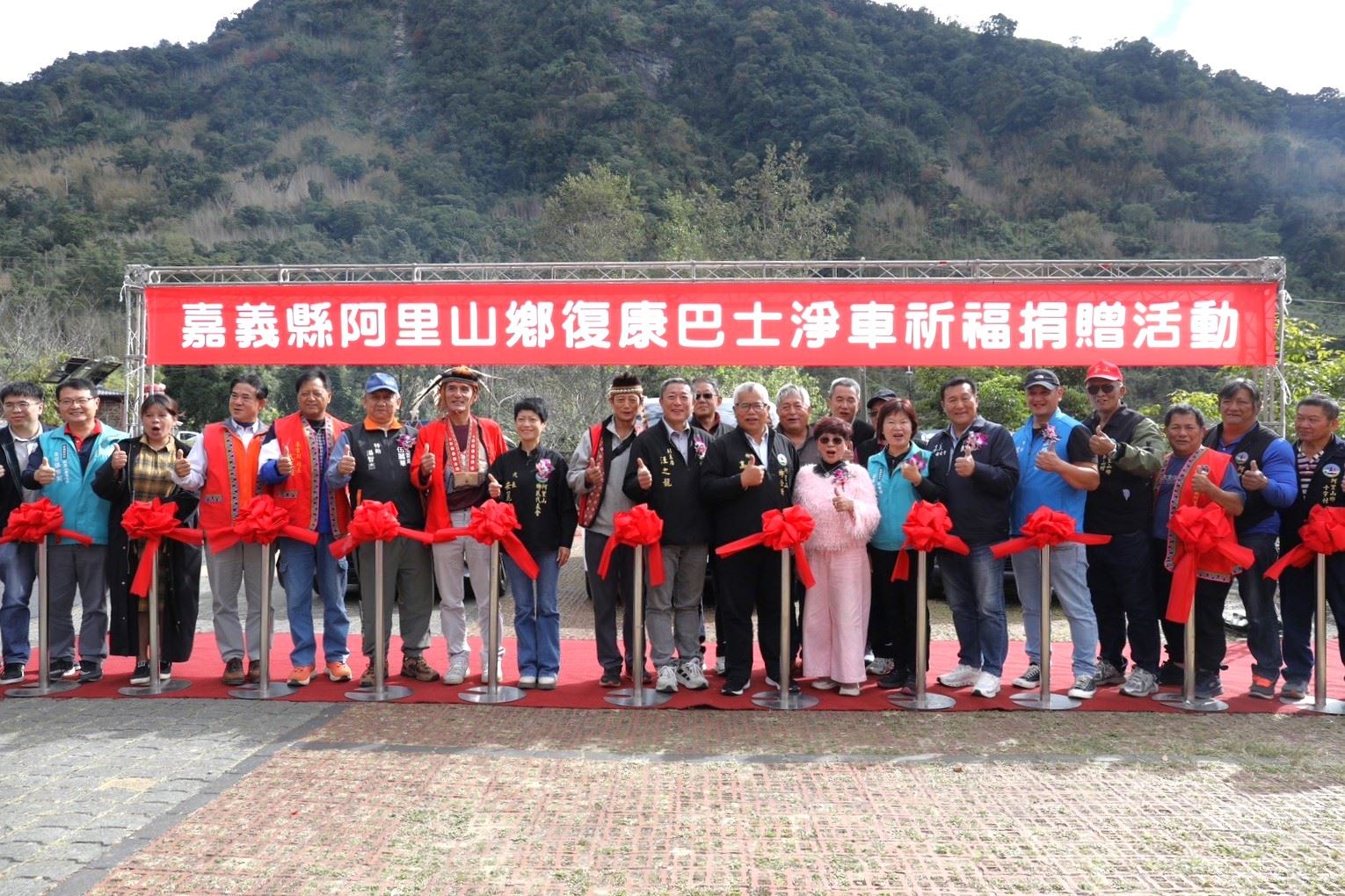 仁義湖畔大酒店捐贈嘉義縣社會局和阿里山鄉公所社福專車,阿里山鄉公所今(24)日在公所前廣場舉行「114年度復康巴士淨車祈福捐贈活動」,儀式由鄉長高瑞芳主持,仁義湖岸大酒店董事長蔡惠櫻、社會局長張翠瑤、縣議員武清山、晶聖協會總幹事張哲豪等人共同出席。