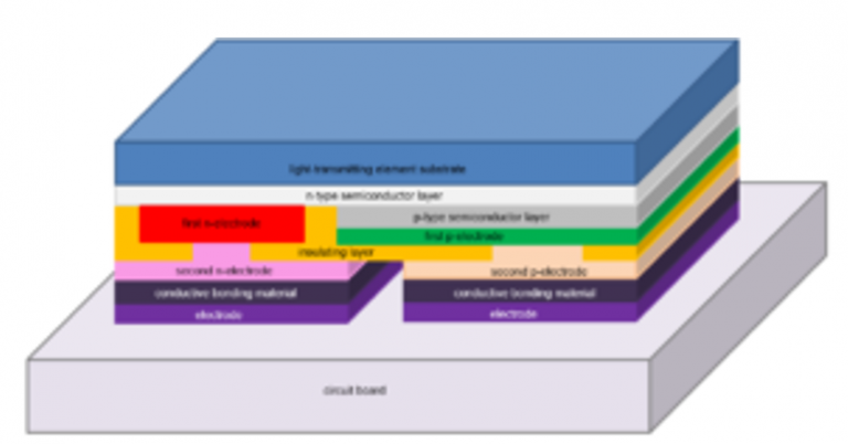 ▲億光美國覆晶專利US 7,554,126之LED覆晶及封裝技術的立體示意圖。(圖/億光提供)