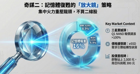 另一個攸關台股主動式ETF績效強弱的重要關鍵,就是在記憶體股的佈局上。00991A現只單壓DRAM製造的南亞科(2408)及儲存型快閃記憶體(NAND Flash)的群聯(8299),雖然只單壓2檔記憶體股,但基金醫生馮志源觀察到,這二檔記憶體股總權重就佔其規模高達近16%,是所有台股主動式ETF佈局記憶體族群比重最高的,而且分別都是台股DRAM及NAND Flash的龍頭股,其他二線記憶體股均不在00991A的佈局之列,顯見它的「放大鏡」策略相當明確!