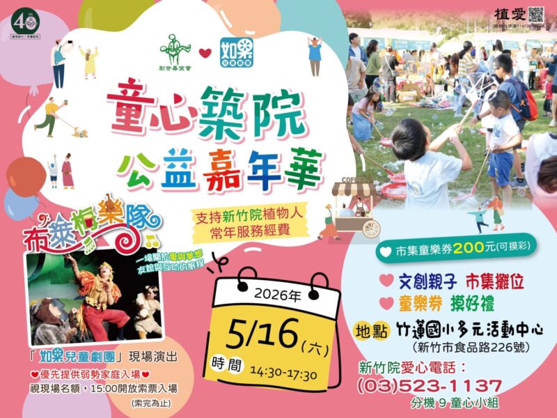 ▲創世新竹院,如果兒童劇團將於5月16日下午2點至5點在新竹市竹蓮國小多功能活動中心舉辦 「童心築院」公益嘉年華。邀請愛心企業、善心團體以及社會大眾一同響應支持,化感動為行動,幫助新竹在地清寒植物人。(圖/創世新竹院提供)