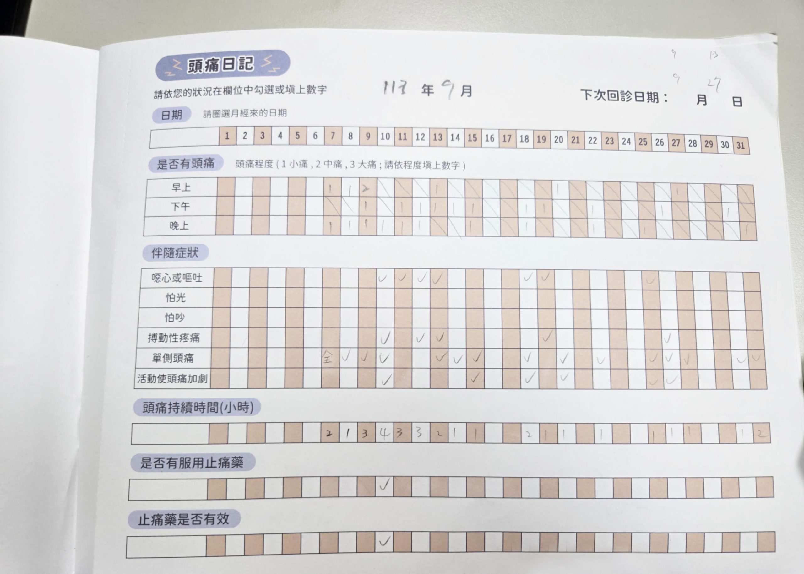 王男依醫囑紀錄每日頭痛程度、持續時間與可能誘因,醫師透過日記資料調整治療策略,症狀於一個多月後便下降超過一半,從「天天痛」改善到「每週僅1–2次」。三個月後更僅在天氣變化、壓力大或睡眠不足時偶發頭痛。