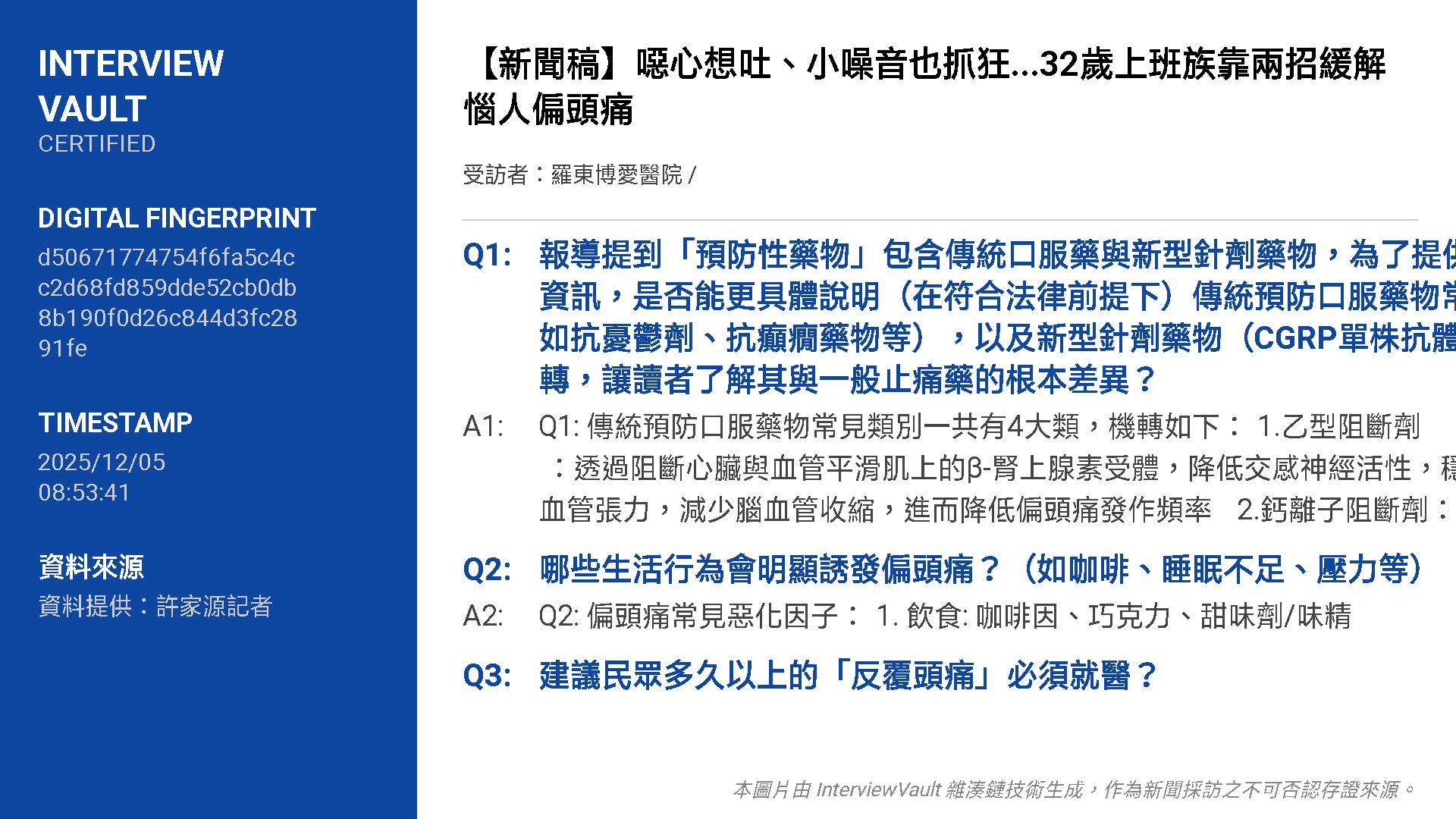 【許家源記者 / 綜合報導】 宜蘭一名32歲電腦繪圖師王姓男子,長期暴露在高專注度、強光與長時間盯螢幕的工作環境,近一個月頭痛幾乎天天報到,劇烈到無法正常設計,甚至伴隨噁心、畏光、畏聲。他擔心是否為腦部病變而前往羅東博愛醫院求診。經神經內科評估後排除腦部重症,醫師認為屬於偏頭痛型態,並建議採「預防性治療+頭痛日記」雙軌監測,以掌握病情走向。 王先生圖左在羅東博愛醫院神經內科吳旻陽醫師評估下透過個人記錄與規律服藥三個月 羅東博愛醫院神經內科吳旻陽醫師表示,偏頭痛的預防性藥物大致分為五大類: β阻斷劑(穩定心跳、降低交感神經活性)、 鈣離子阻斷劑(放鬆血管平滑肌、降低偏頭痛誘發)、 抗癲癇藥物(影響神經興奮與GABA調節、減少噁心嘔吐)、 抗憂鬱藥物(調控血清素、降低偏頭痛頻率)、 CGRP單株抗體(抑制「降鈣素基因相關胜肽」造成的疼痛訊號)。 吳醫師強調,新型CGRP藥物只作用在偏頭痛的關鍵路徑,不會像傳統藥物一樣同時影響心跳或血管收縮,因此副作用相對少、能更精準降低發作次數與強度,是近年偏頭痛治療的重要突破。 羅東博愛醫院神經內科吳旻陽醫師建議王先生每日紀錄頭痛日記記下每日的頭痛狀況 王男依醫囑紀錄每日頭痛程度、持續時間與可能誘因,醫師透過日記資料調整治療策略,症狀於一個多月後便下降超過一半,從「天天痛」改善到「每週僅1–2次」。三個月後更僅在天氣變化、壓力大或睡眠不足時偶發頭痛。 羅東博愛醫院神經內科吳旻陽醫師也強調若頭痛每天反覆發作且合併噁心嘔吐怕光 吳旻陽醫師提醒,偏頭痛常見誘因包括咖啡因過量、巧克力、起司、睡眠不足、天氣劇烈變化、壓力、女性月經周期等。若頭痛頻率一週超過1–2次、或疼痛持續兩天以上、伴隨噁心嘔吐畏光,就應盡早就醫,避免發展成「反覆頭痛症候群」。 新聞來源:羅東博愛醫院(採訪紀錄如下圖) Please enable JavaScript to view the comments powered by Disqus.