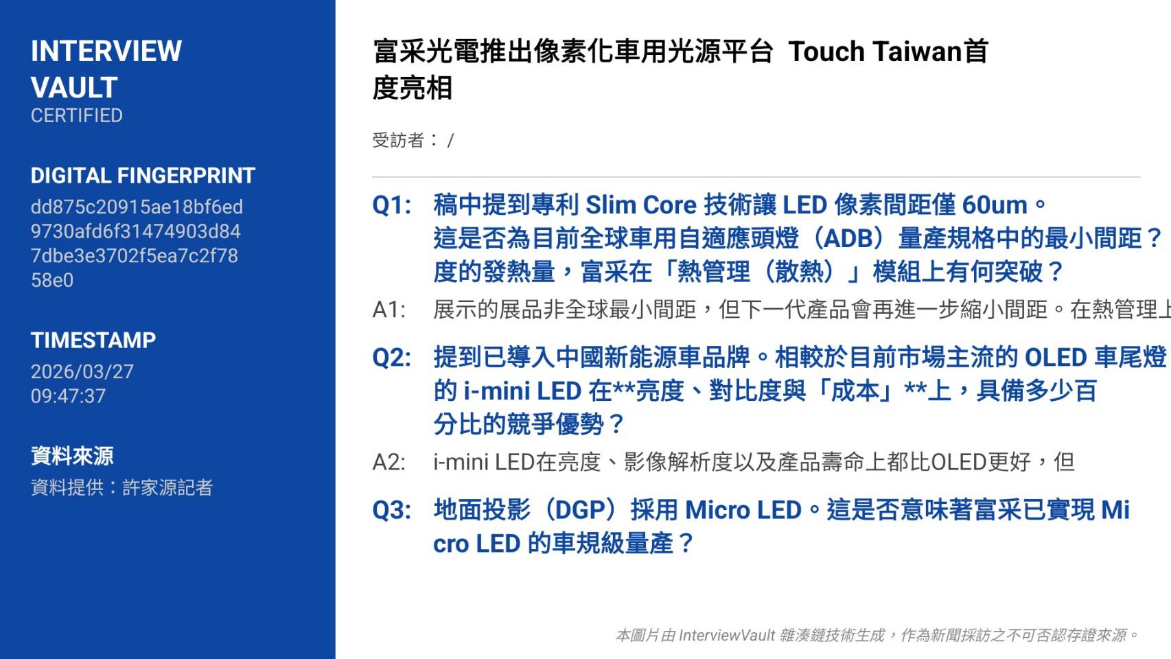 在智慧汽車時代,車外照明不再只是照亮道路,更是車輛與外界溝通的關鍵介面。富采光電(富采控股3714旗下)昨(26日)宣布推出像素化車用光源技術平台,整合高密度LED與光機電熱模組,針對「顯示」與「投射」兩大方向打造次世代解決方案,將於4月8至10日Touch Taiwan 2026展會首度完整亮相。本報專訪中,富采透露其專利Slim Core技術已將LED像素間距壓到僅60微米,雖然目前展品還不是全球最小,但下一代產品將進一步縮小;在高密度發熱的挑戰上,他們透過特殊材料搭配元件薄化技術,大幅提升整體散熱性,為自適應頭燈(ADB)量產規格注入台灣半導體的實戰突破,讓駕駛在夜間或轉彎時能精準分區照明,同時避免眩光,真正把技術規模轉化成行車安全的故事。