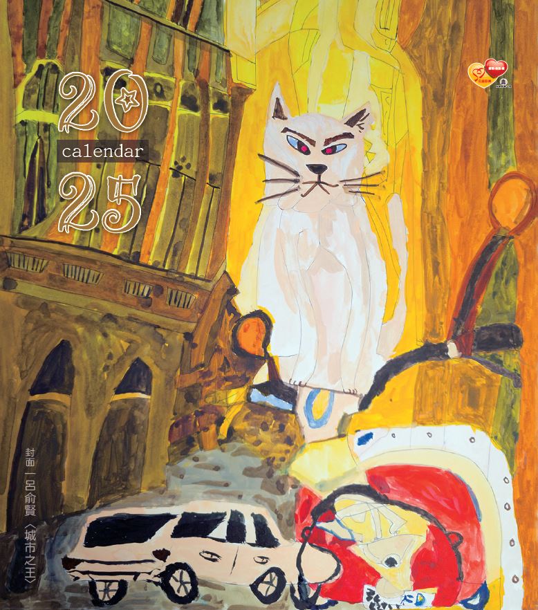 入住中和崇愛中心的呂俞賢是位心智障礙者,雖不擅言語表達,但透過畫筆抒發內心的孤獨世界和渴望,不僅連年獲得新北市「愛在畫中」優勝,也曾入選日本東京第9回國際交流展。由於他父親今年往生,母親年邁,且家中還有一位同為心智障礙的哥哥,僅依撿拾資收貼補家用。社會局媒合圓融行善團幫忙,圓融集資捐贈22萬元,呂俞賢回贈2025年作品「城市之王」,該幅作品還成為社會局年度桌曆的封面。