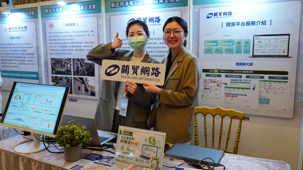 新北市淨零公正轉型成果交流會,現場企業攤位展示節能減碳技術與應用成果。 (新北經發局提供)