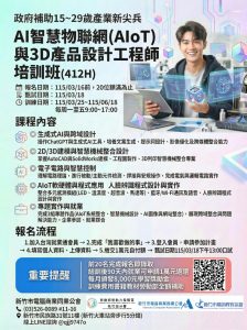 ※報名資訊:「AI 智慧物聯網 (AIoT) 與 3D 產品設計工程師培訓班」預計 115 年 3 月 25 日開課,3 月 16 日報名截止。