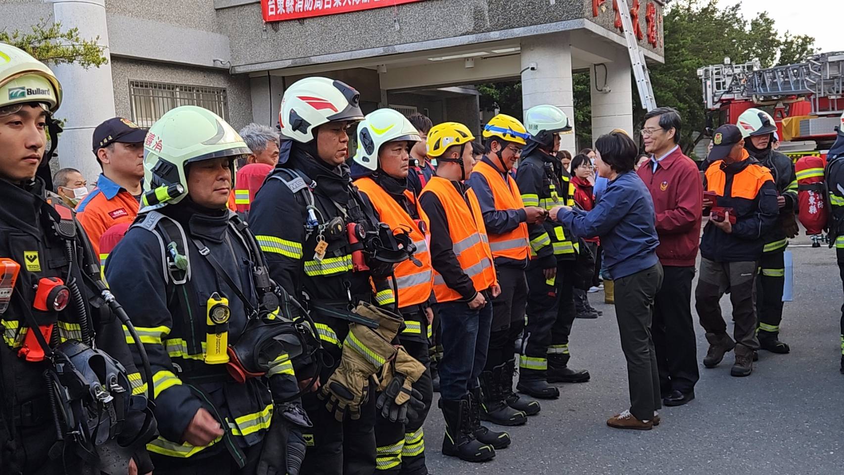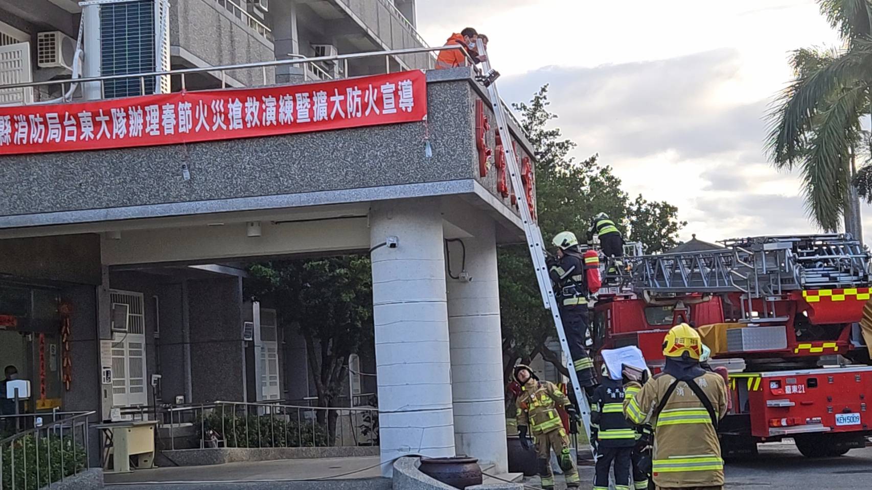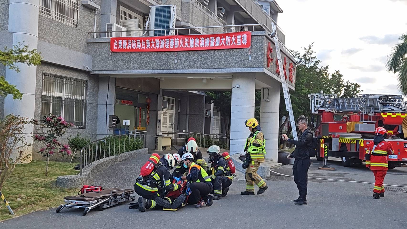農曆春節將至,台東縣消防局台東大隊為加強救災整備工作,確保民眾與遊客平安過年,於今(23)日下午在私立台東仁愛之家舉行春節期間加強地震暨火災實兵演練,提升民眾逃生及防火防災觀念,以及大量傷病患的處置與後送。縣長饒慶鈴、議員簡維國、消防局長盧東發等貴賓親臨現場慰問參與演習的同仁與義消,另連江縣消防局長曹典鈺也前來觀摩,感謝大家在年前辛勞投入整備工作,守護縣民生命財產安全,呼籲鄉親在歡慶假期之時,亦要隨時注意用火用電安全,確實做好各項災害預防及事先檢查工作。