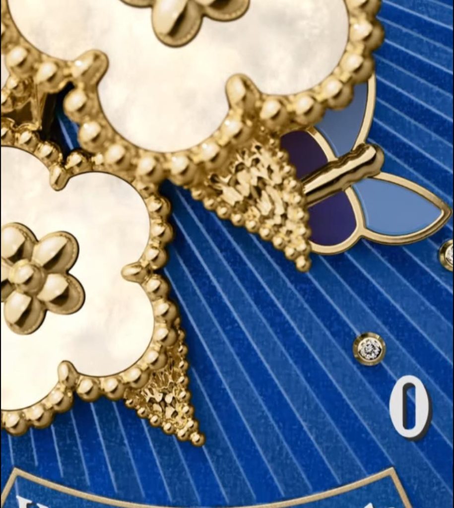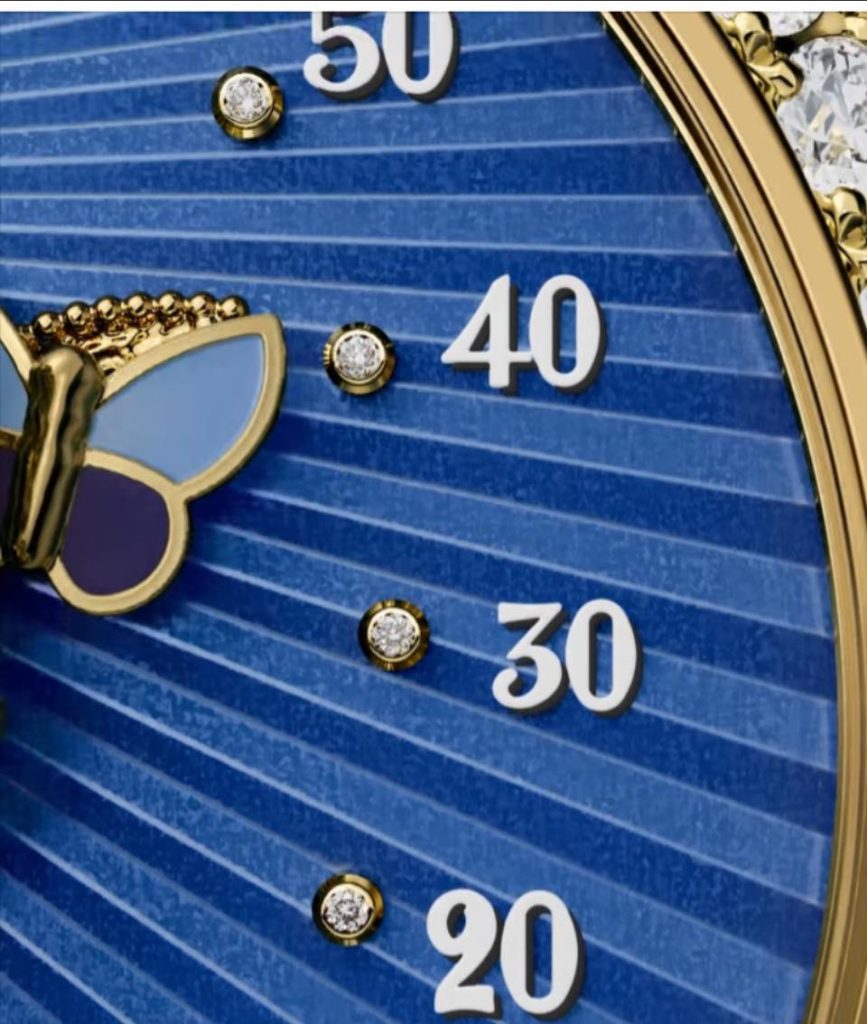 藍色放射紋錶盤,像天空被打開——鑽石是光的節點,花朵是時間的停頓,而蝴蝶,則在時間遊走。