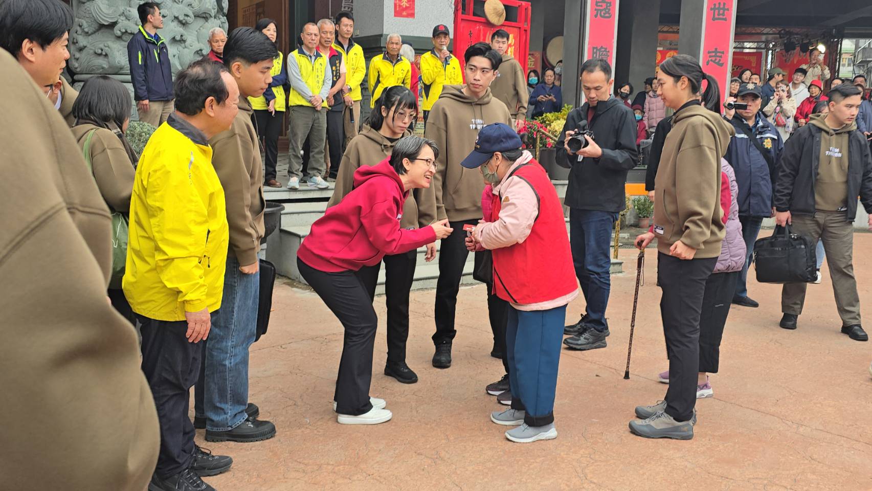 副總統蕭美琴18日下午到宜蘭二結王公廟參拜祈福,並在廟埕發送福袋,民眾排隊領取。