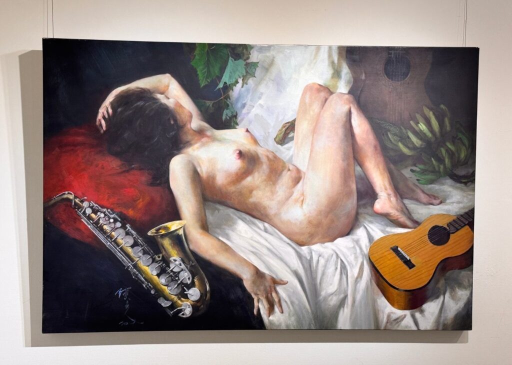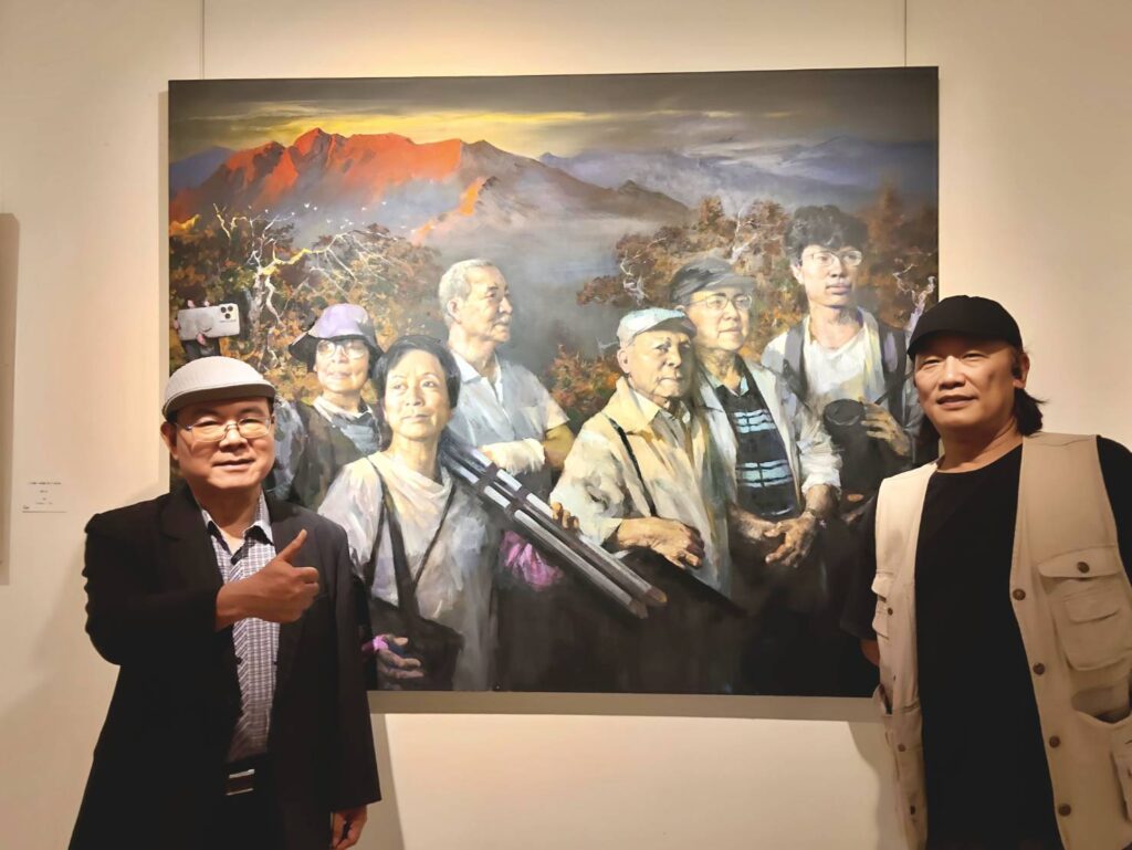 三、也是2025年油畫〈我與靑山是舊遊〉,取自詩詞意境,傳達藝術家與自然如老友般的情感。畫面中,一群繪畫愛好者身背畫架與腳架,在夕陽映照的玉山山脈前駐足,展現出藝術同好間的世代傳承與集體共鳴。