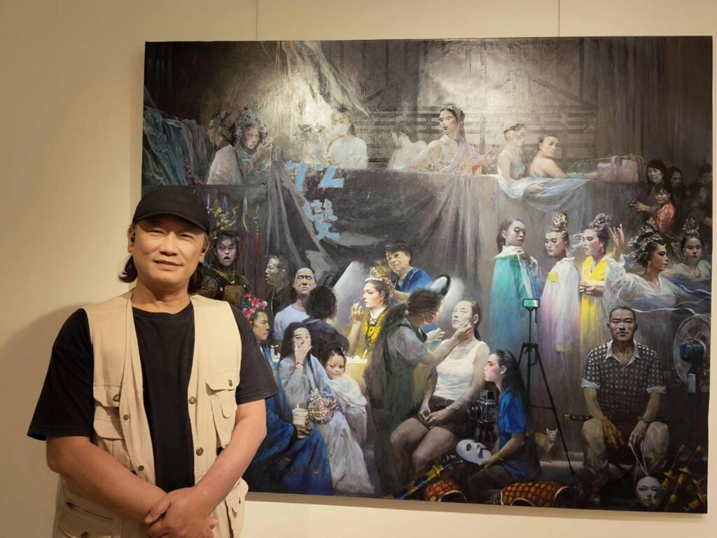 二、2025年油畫新作〈試春服—北港藝閣幕後〉,是一幅充滿本土人文溫度的傑作。陳立人將視角對準北港朝天宮遶境中獨特的藝閣後台,描繪藝員、化妝師在演出前忙碌整備的眞實瞬間。標題「試春服」象徵著季節與文化的傳承,在燈光掩映間展現民間信仰強韌的生命力。