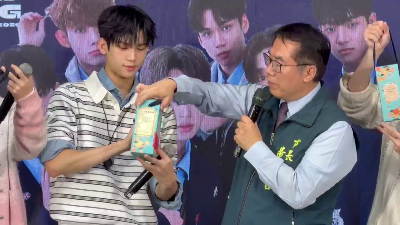 ▲新世代男團 F.F.O接受市長送的精美禮品(圖/金東天 攝) 今日記者會由市長黃偉哲、新世代男團 F.F.O、三三讀書會會長陳苡銜及多位民代共同參與,場面熱鬧。市府誠摯邀請全國民眾,年底一起來台南追星、玩親子活動、吃美食,感受府城獨一無二的節慶魅力。