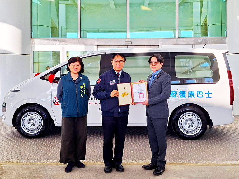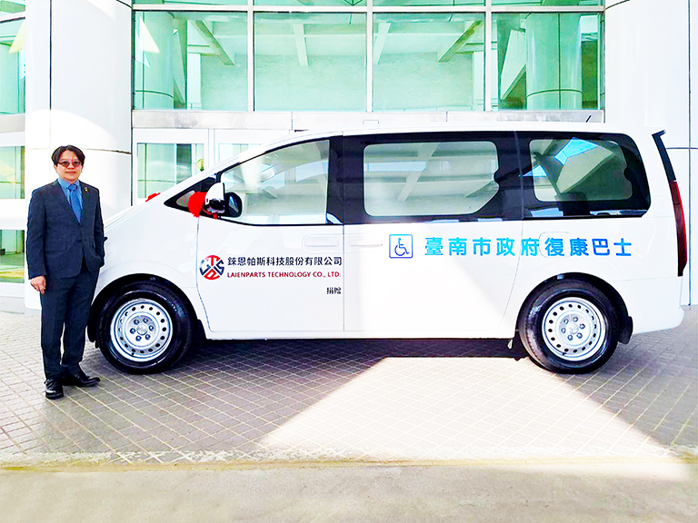 ▲錸恩帕斯科技捐贈復康巴士;臺南市長黃偉哲代表受贈。(圖/記者吳玉惠拍攝)