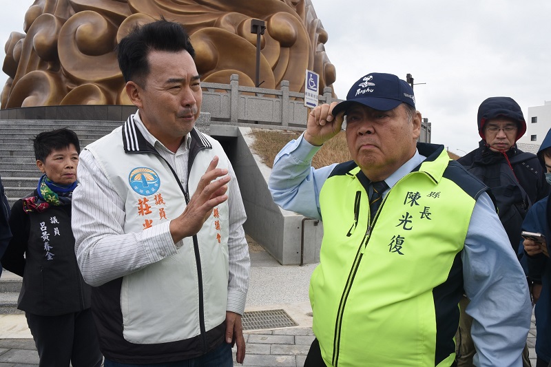 澎湖縣議會第20屆第6次定期會縣政總質詢,議員莊光大實地走訪媽祖文化園區,關心周邊工程及藍色公路整體規劃與執行。縣長陳光復表示,縣府對文化園區的整體建設從未停下腳步,未來透過招商、內海藍色公路的進行,園區將成為兼具地方特色與國際視野的亮點景區。