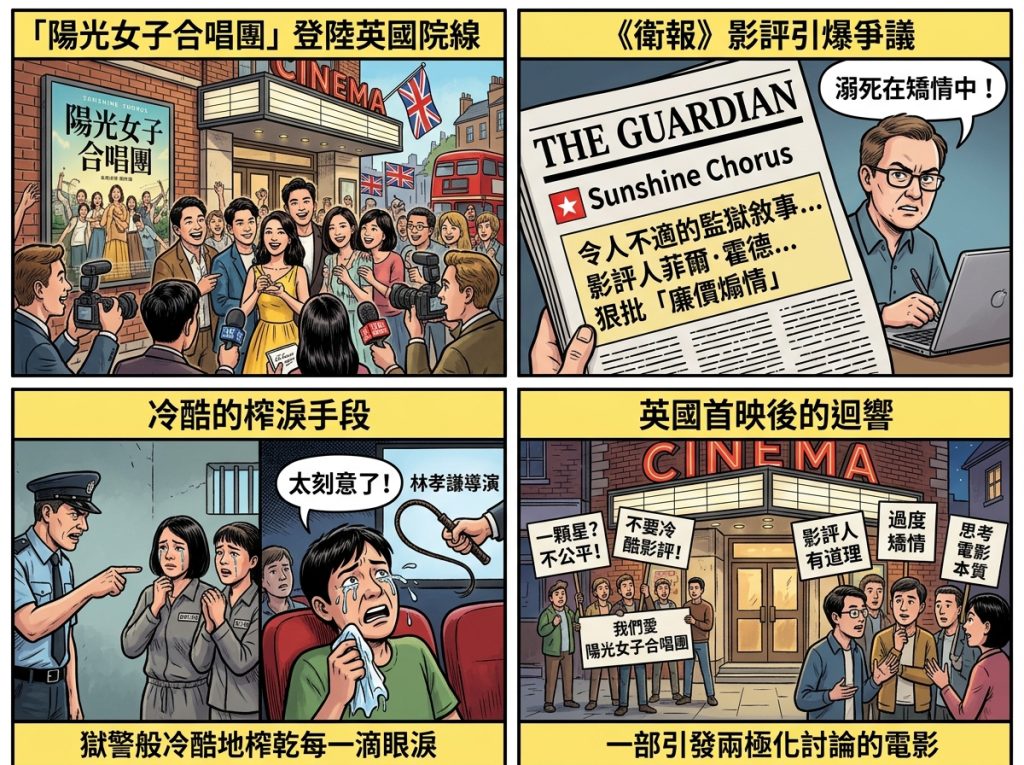 刷新台灣影史國片票房紀錄的催淚大作《陽光女子合唱團》,正式登陸英國院線。然而在上映前夕,英國權威媒體《衛報》(The Guardian)發布一篇影評引發影壇熱議。影評人菲爾·霍德(Phil Hoad)毫不留情地給予該片最低的「一顆星」評價,更直言這是一部「溺死在矯情中」的電影。