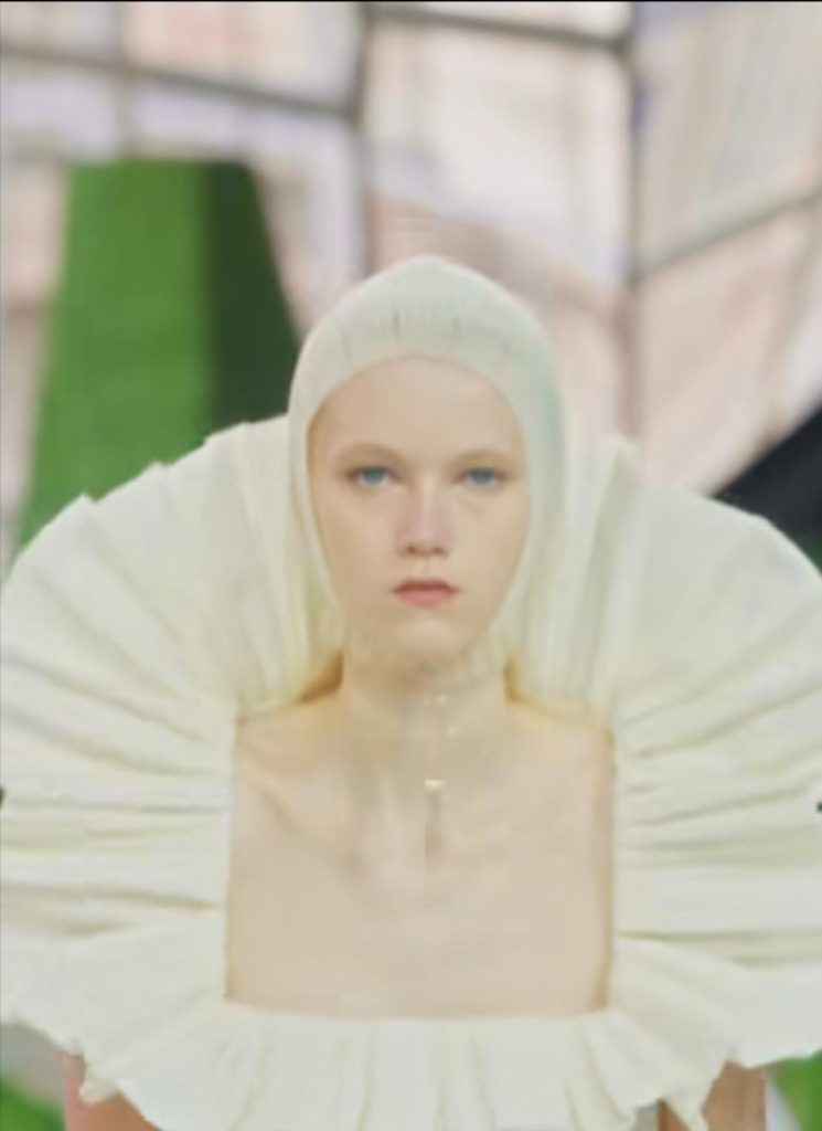 模特兒像是一群跨越時空的遊牧民族,有的像修女,也有人像科幻電影中的探險者。誇張的肩線與雕塑領口,使身體變成一種象徵,而不只是造型。