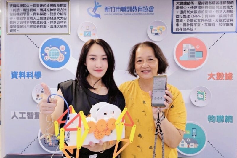 ▲報名參加勞動部桃竹苗分署委託新竹市職訓教育協會辦理「機械製圖及智慧自動化設計人才培訓班」的莊美絨同學(右),訓後利用工作之餘持續回新竹職訓優化結訓專題作品,強化機構及程式的設計,精神值得敬佩。新竹市職訓教育協會執行長鄔佩儒(左)與莊美絨同學暨作品一同合影。(圖/新竹市職訓教育協會提供)