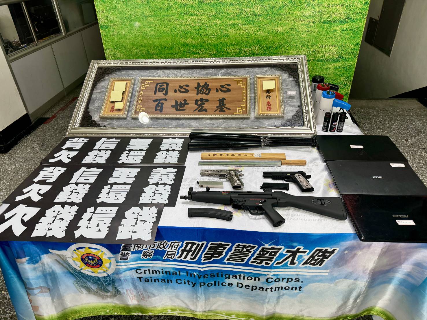 兵分十路拘獲鐘姓主嫌與成員共計12人到案,起獲鋁棒、西瓜刀、辣椒水、空氣槍、仿MP5電動氣槍、○○茶行匾額、筆記型電腦、「欠錢還錢」磁性軟板、大聲公等證物。