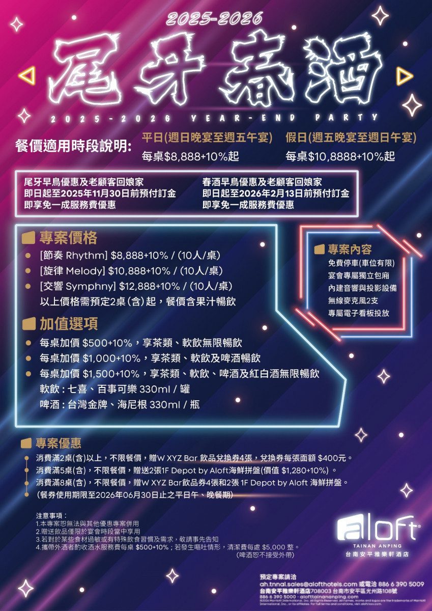台南安平雅樂軒酒店亦提供早鳥訂席優惠,即日起至 2025年11月30日前付訂尾牙訂席,享免10%服務費;春酒訂席則於 2026年2月13日前付訂,同享免服務費禮遇,對企業而言是最划算的訂席時機。加上滿額即可獲得飲品兌換券與海鮮拼盤等贈禮,亦可作為 員工抽獎加碼獎品,為年度聚餐創造更多儀式感與期待值。訂席專線:06 390 5009 或email: ah.tnnal.sales@alofthotels.com