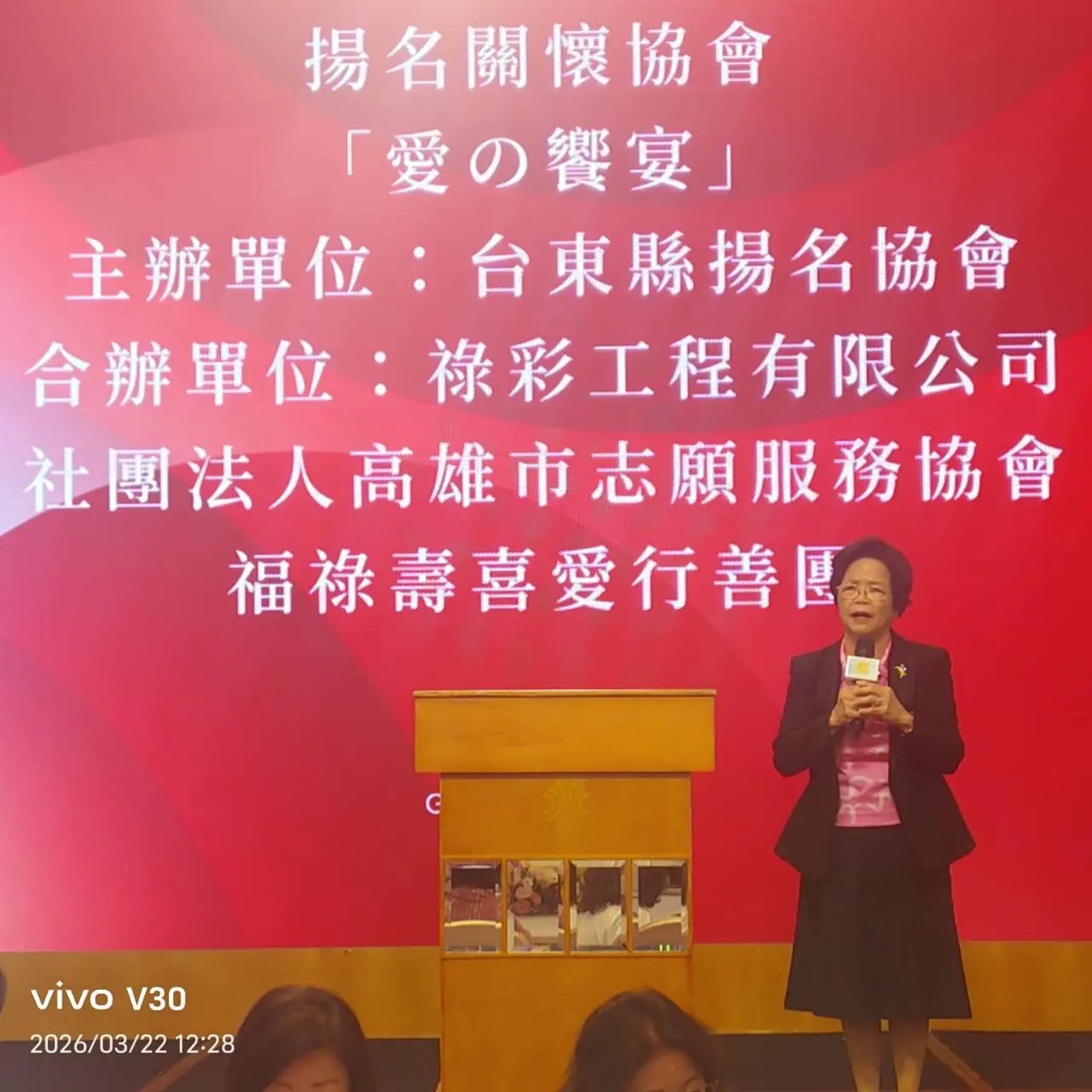 為傳遞社會溫暖、凝聚公益力量,台東縣揚名關懷協會於3月22日中午在高雄漢來大飯店九樓金龍廳舉辦「人間有愛,溫情常在」愛之饗宴,現場席開盛會,吸引超過200位來自高雄、台東及各界公益夥伴齊聚一堂。