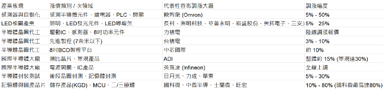 在感測半導體及自動化方面,日本大廠歐姆龍(Omron)也將感測半導體元件、繼電器、PLC等產品自即日起調漲5%至50%;晶圓代工廠力積電也已於年初調漲感測半導體元件與驅動IC的價格,8吋功率元件代工報價調。晶圓代工大廠台積電則宣布調漲7奈米以下先進製程3%至10%的價格,中芯國際則對8吋BCD製程平台調漲約10%。