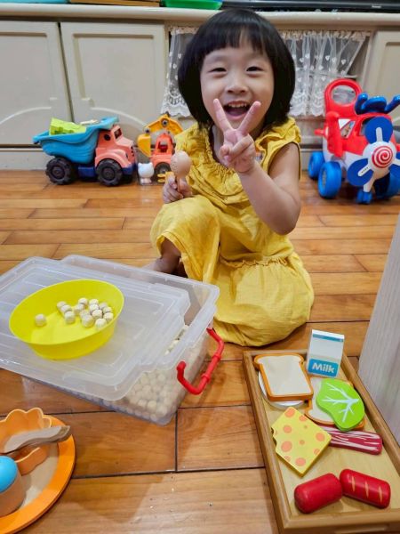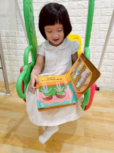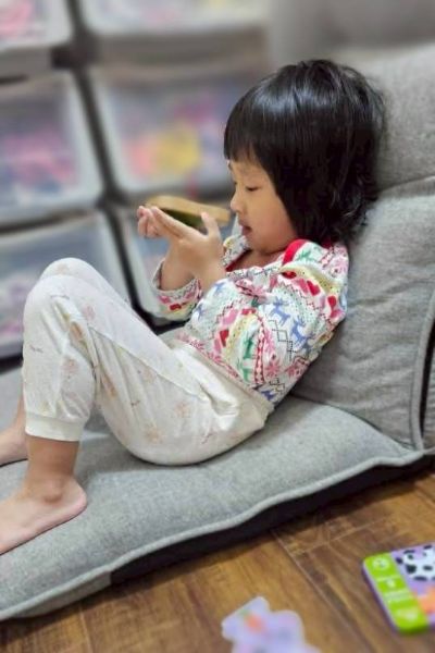 直到有一天,一向喜歡扮演遊戲的小女兒,睡前親子時光時,坐在家中小小閱讀角落,手裡拿著一支玩具手機