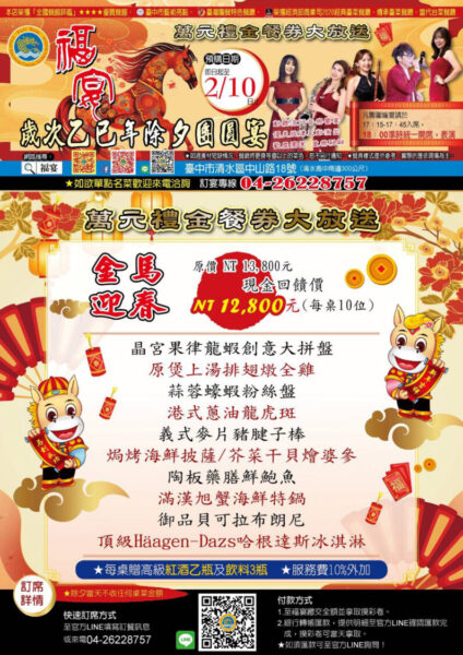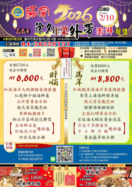 (焦點時報/總社長孫崇文、記者鄒志中報導) 「金馬騰躍迎新歲!福宴創意美食夯!」、「馬躍新春!饗宴滿堂!」想像一下,當金馬奔騰的喜慶號角響徹天際,農曆丙午馬年以無比活力闖入您的生活!臺中清水區的美食傳奇「福宴國際創意美食」(Full Yuan International Cuisine Fresh Seafood Restaurant)在此刻華麗蛻變,推出震撼人心的2026年農曆新年圍爐專案「馬躍新春 饗宴滿堂」。這場如煙火般璀璨的饗宴,將於2026年2月10日(農曆正月初一)爆發無限魅力,融合古老中華美食的魂魄與前衛創意的火花,為每位賓客獻上一場震撼五感的狂歡派對!無論是溫馨家庭圍爐、熱鬧企業尾牙,還是好友狂歡聚會,福宴國際創意美食精心打造的多款夢幻套餐,從NT$6,000元起飛直衝NT$13,800元,每桌10位賓客,服務費僅加10%,讓您在金碧輝煌的殿堂中,盡情沐浴海鮮的鮮美浪潮與節慶的熾熱激情!