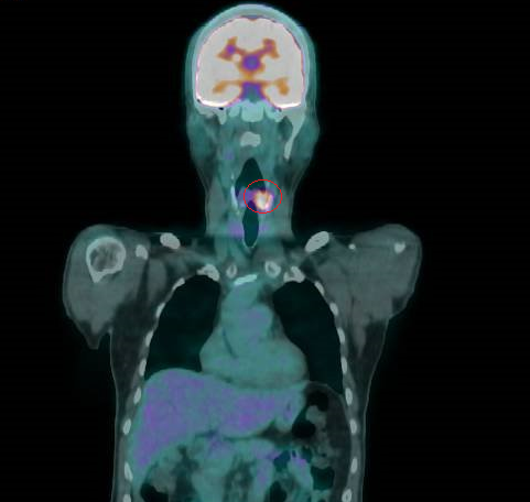 ▲正子攝影顯示曾先生的下咽癌再度復發(紅圈處)。(圖╱彰化醫院提供)
